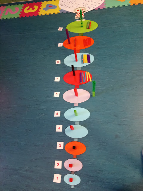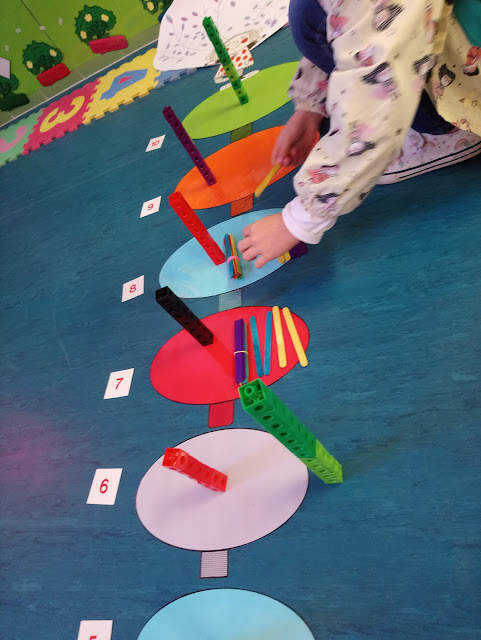 Un detalle que se puede observar en las dos fotos que también se incorporan: hallan el doble de los números expresados estos en tres códigos: la cifra escrita; los bloques encajables y los palillos.